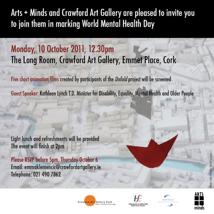 World Mental Health Day, 10 October 2011 All are welcome, but booking is essential. Please email emmaklemencic@crawfordartgallery.ie 0.000000 0.000000 Share this: Email a link to a friend (Opens in new window) Email Print (Opens in new window) Print Like Loading... Related Leave a comment Cancel reply Δ