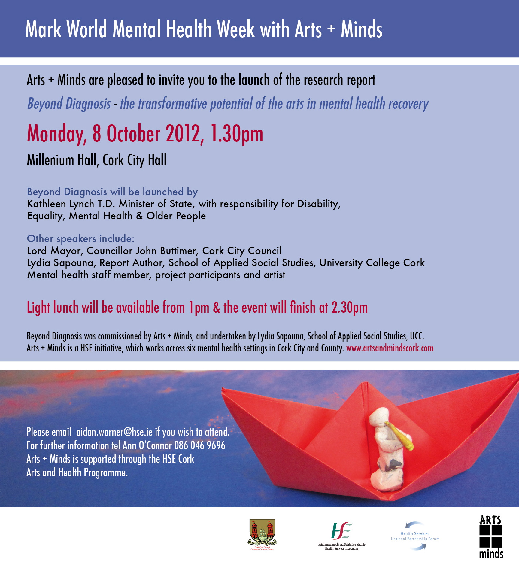 All are welcome, but booking is essential. Please email aidan.warner@hse.ie if you wish to attend. Speeches will commence at 1.30pm and the event will finish at 2.30pm. Contact Ann O’Connor at +353 86 0469696 with any queries.