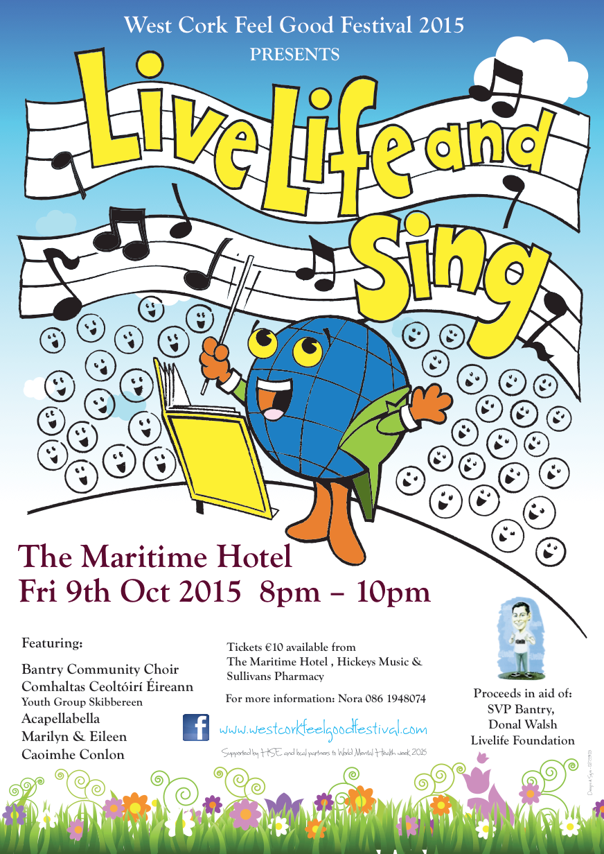 World Mental Health Day takes place each year on October 10. Lots of events take place in and around this time of year and our colleagues in West Cork are hosting a wide range of events today Friday Oct 9 and tomorrow Oct 10 as part of the West Cork Feel Good Festival. Highlights include the Live Life and Sing concert (tonight Oct 9, Maritime Hotel, 8pm) and The West Cork Big Sing tomorrow (Marquee, Bantry Square, 4pm, Oct 10). All are welcome and the majority of events are free of charge. The full programme can be found at westcorkfeelgoodfestival.com.
