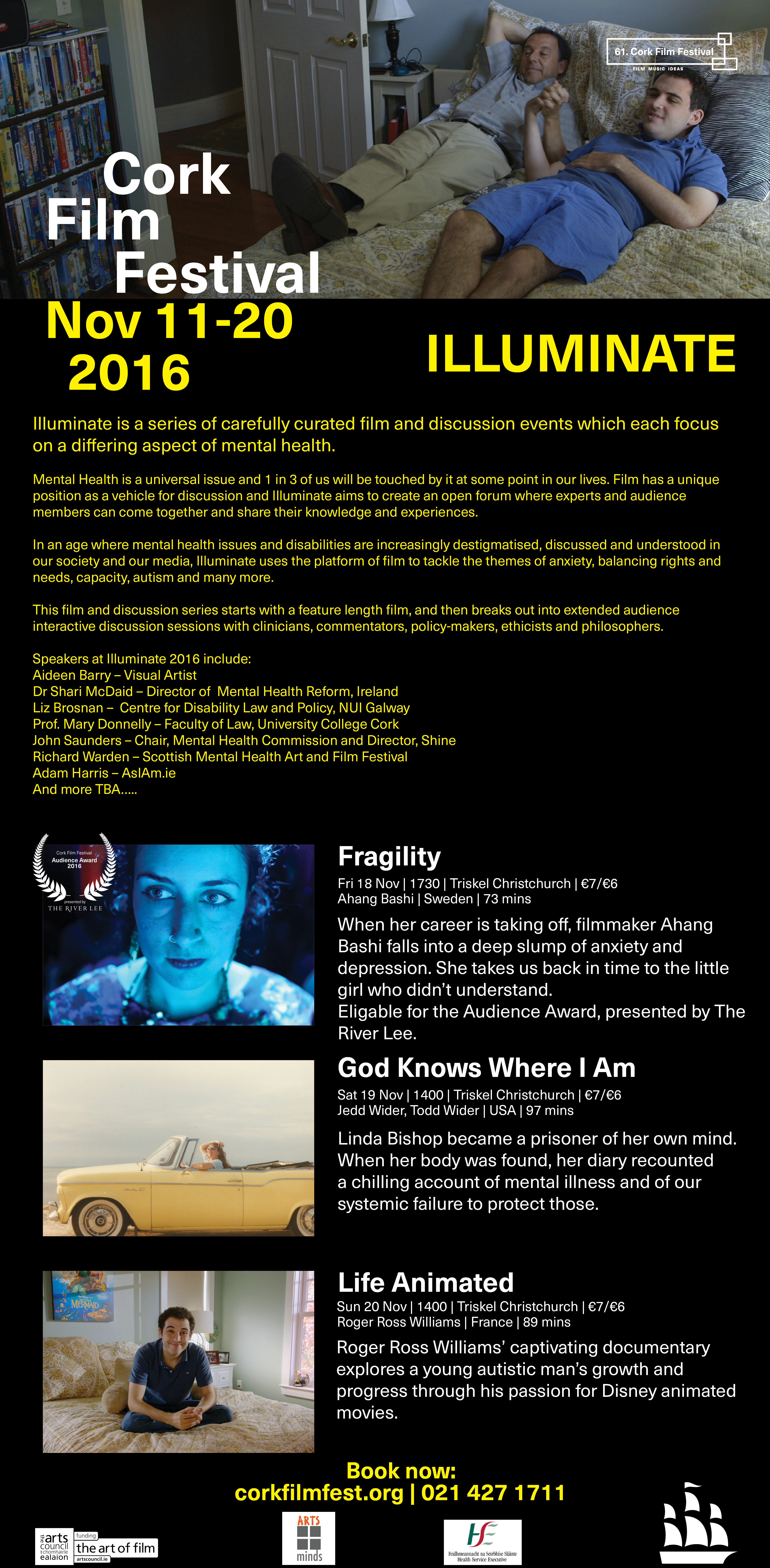 Illuminate takes place over three days, Fri Nov 18 – Nov 20, during Cork Film Festival. All film screenings take place in Triskel Arts Centre and are followed by discussion with invited panelists and audience members. See below and visit the Cork Film Festival website for more information, and please do encourage colleagues, family and friends to support this great initiative.